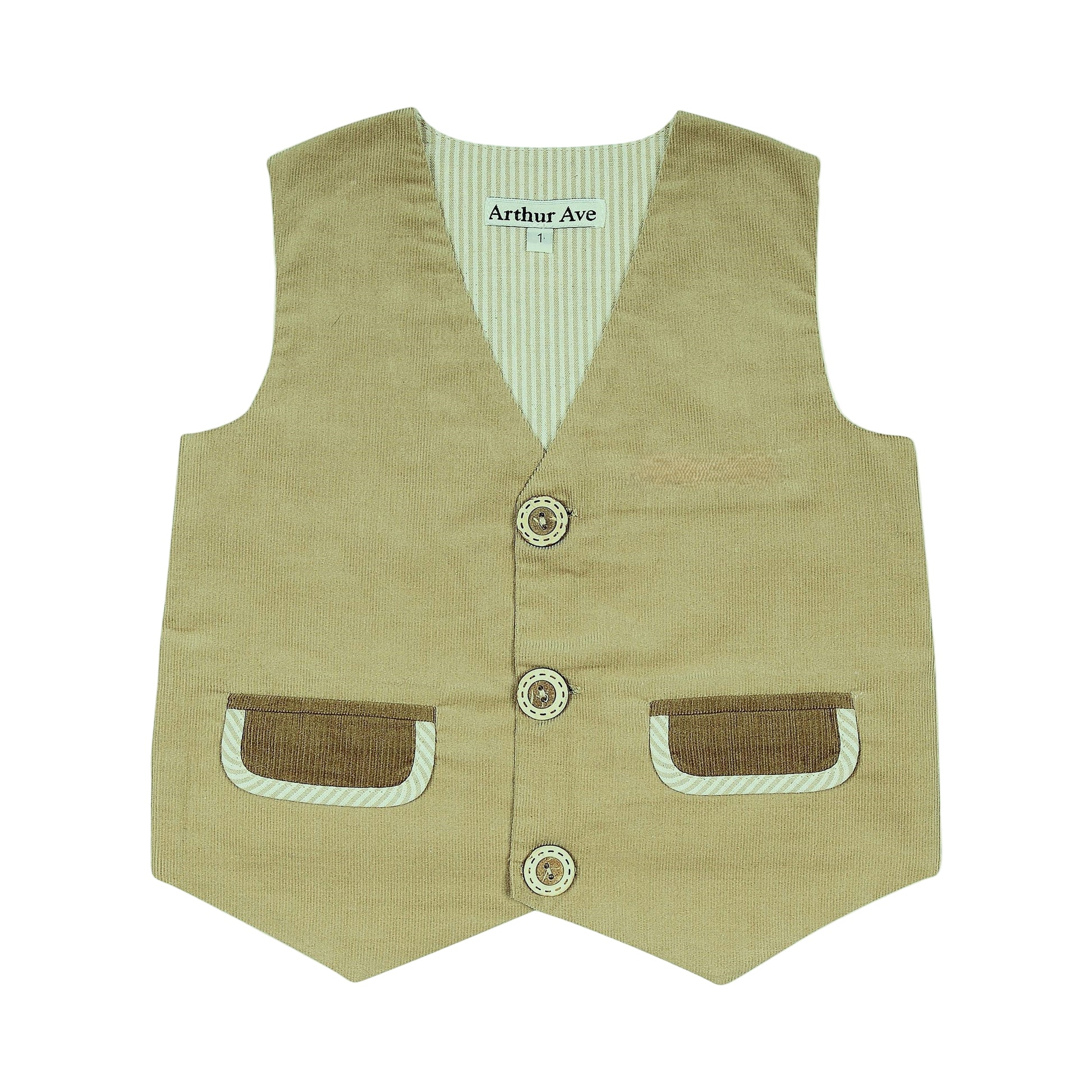 From the "Chorduroy Boys" collection comes the super fine & soft Corduray Waist Coat. Vintage inspired, this darling waist coat with side flap pockets is detailed with pinstripe fabric which also lines the inside and is used for the back. Front closure is with three buttons. A perfect match with the Chorduroy Boys Patchy Pants. By Arthur Ave.