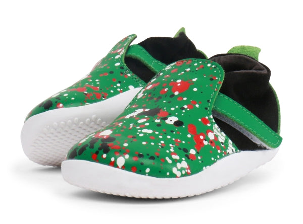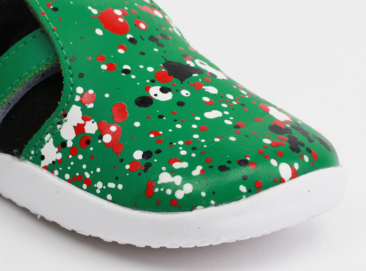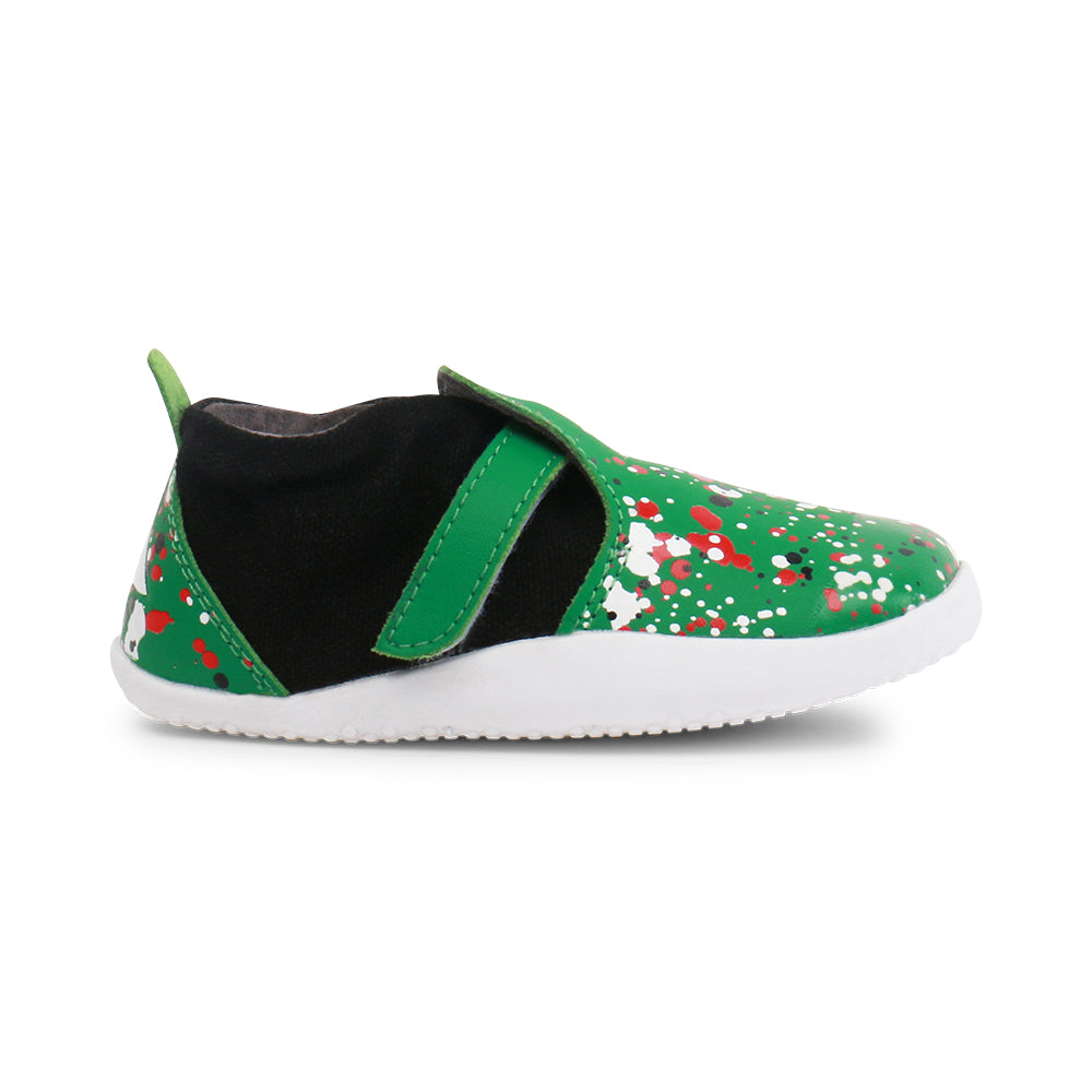 This playful Xplorer style takes fun, explosive styling and pairs it with innovative design. The ultra-flexible, lightweight sole follows the natural shape and movement of children's feet as they learn to walk, nurturing their development and spatial awareness. Printed leather and a cotton canvas mid-section provide breathability, while a squirm-proof elastic ankle and strap fastening ensure a comfortable, secure fit. Available in a Emerald Spekkle Splatter. Designed in New Zealand.